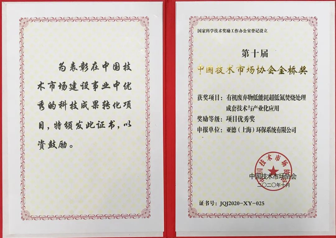近日,第十屆中國(guó)技術(shù)市場(chǎng)協(xié)會(huì)金橋獎(jiǎng)表彰獎(jiǎng)勵(lì)大會(huì)在山東淄博舉行。亞德集團(tuán)“有機(jī)廢棄物低能耗超低氮焚燒處理成套技術(shù)與產(chǎn)業(yè)化應(yīng)用”項(xiàng)目,榮獲金橋獎(jiǎng)項(xiàng)目?jī)?yōu)秀獎(jiǎng)。
