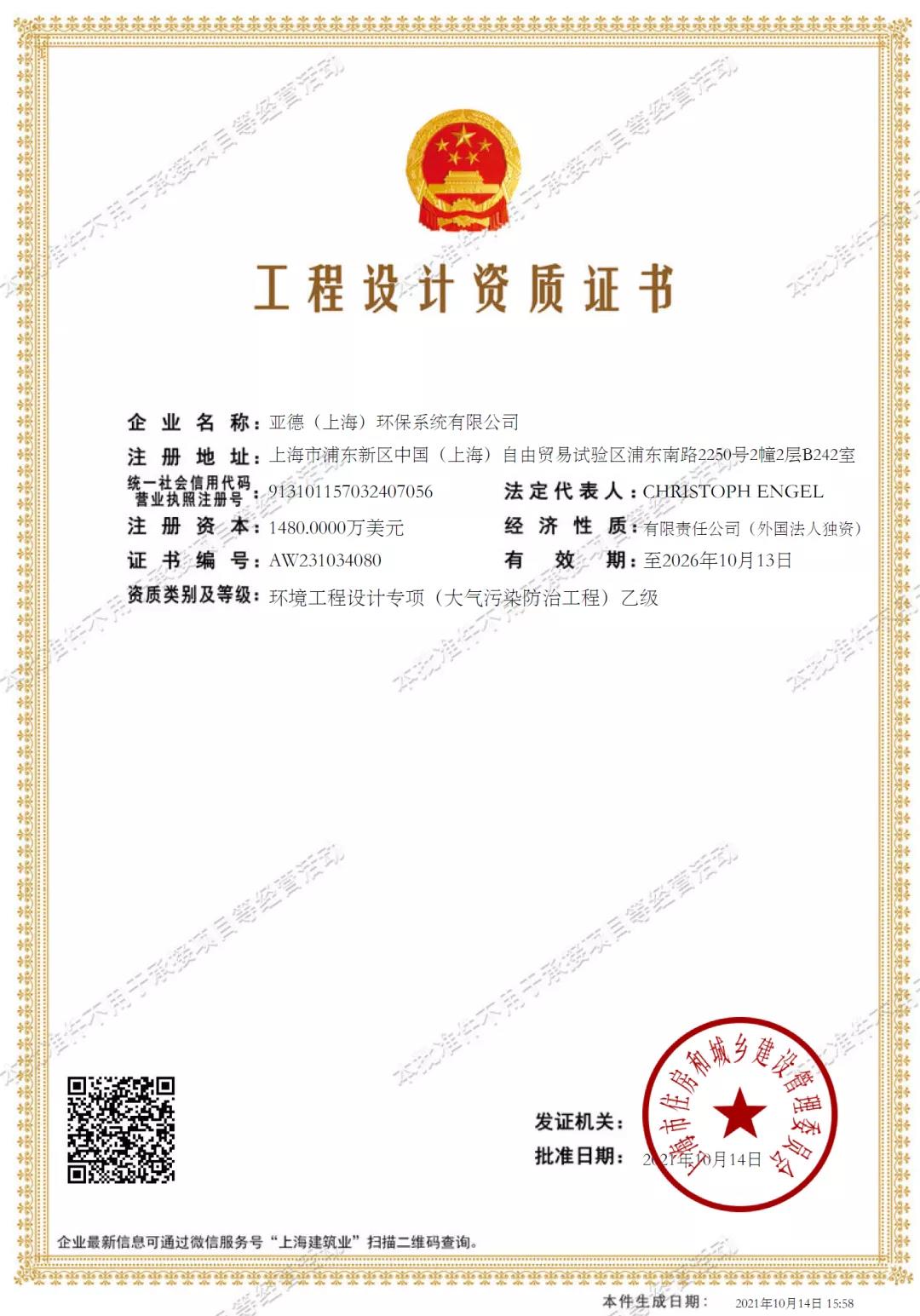 經(jīng)過(guò)兩年的努力,亞德(上海)環(huán)保系統(tǒng)有限公司成功取得環(huán)境工程設(shè)計(jì)專項(xiàng)(大氣污染防治工程)乙級(jí)資質(zhì)。