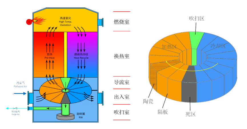 旋轉(zhuǎn)式RTO出現(xiàn)在20世紀90年代末,是RTO發(fā)展的第三代技術(shù)。通過旋轉(zhuǎn)閥 (蓄熱筒) 旋轉(zhuǎn)、分度、廢氣均布等動作,順序地引導廢氣進入或排出燃燒室的特定部分。通過在轉(zhuǎn)子表面設置的密封裝置,將轉(zhuǎn)子分成入口和出口兩部分,通過這兩部分分別將處理前的廢氣和凈化后氣體引入或排出 RTO 燃燒室。目前旋轉(zhuǎn)式RTO的發(fā)展過程中在其旋轉(zhuǎn)閥的運行方式,吹掃的方式、密封方式以及蓄熱室的分區(qū)都有不一樣的設計,因此也衍生出不同的類型的RTO。