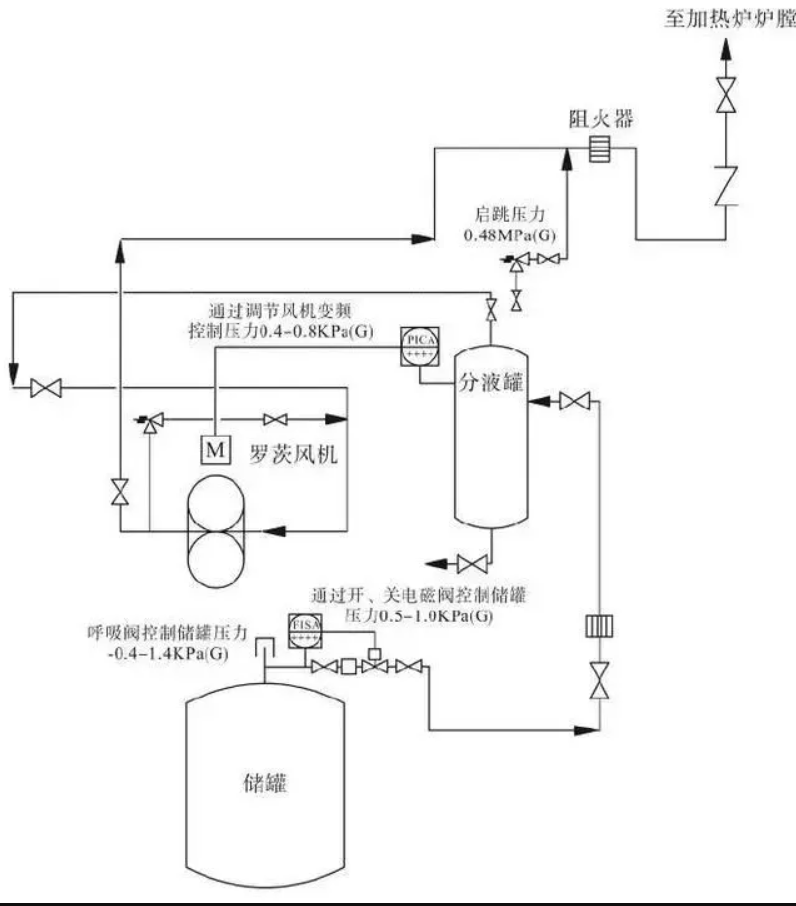 罐區(qū)VOCs 氣體普遍存在氣量及濃度波動大、間歇排放等問題。國外在進行VOCs 處理設計時,會根據(jù)后續(xù)處理工藝整體考慮安全控制措施,評估危險環(huán)境出現(xiàn)的可能性并層層設防,采用的措施主要包括氮封、壓力與氧含量檢測、工藝安全控制聯(lián)鎖、阻火、電氣防爆等系統(tǒng)安全控制方案。