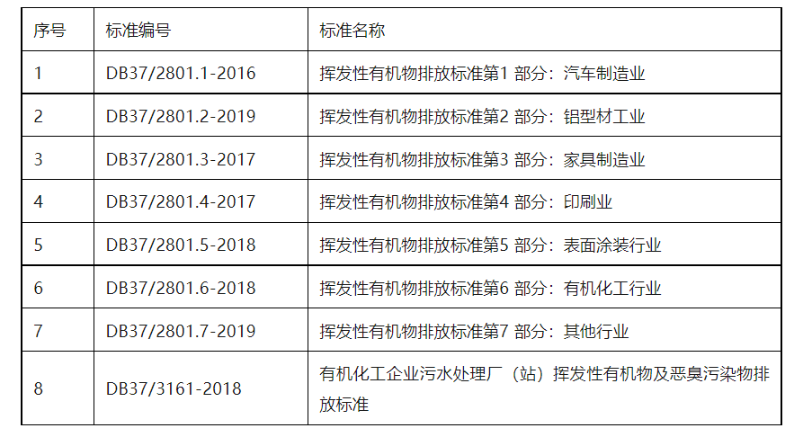 表4 山東省VOCs系列排放標(biāo)準(zhǔn)