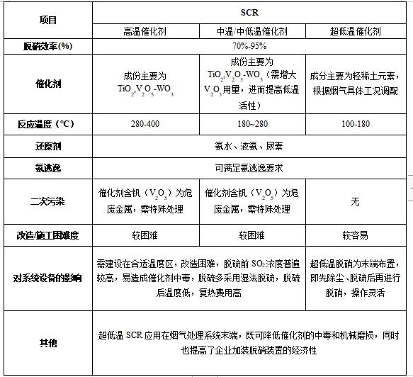 目前國內研發(fā)團隊已開發(fā)出超低溫SCR脫硝催化劑,并在大型電廠、燃煤鍋爐、燃氣鍋爐、化工尾氣、有色行業(yè)煙氣、玻璃行業(yè)煙氣等進行了側線和應用示范。不同活性溫度催化劑對應不同SCR工藝,同時決定了硝酸工業(yè)脫硝工藝的選擇、設備的布置位置和方式,具體如下表所示: